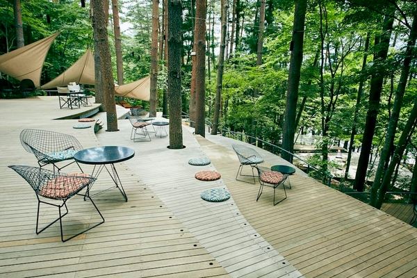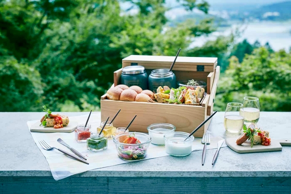 グランピングをコンセプトとする星のや富士には、約6haの広大な森の中に、大自然と触れ合えるリゾート空間がデザインされている「クラウドテラス」があります。クラウドテラスには、森の中にウッドデッキが階層状に広がり、距離感を保ちながら、パブリックスペースとして心地良く過ごせる場所が点在しています。ライブラリーカフェから好みの飲み物や本を手に取り、思い思いの場所で自由にくつろげば、ゆったりとした時間を感じられます。屋外ダイニングのクラウドキッチンでは、1つのタープに2組、最大5組限定で好みのトッピングをし石釜で焼き上げるピザづくりができます。木立に囲まれ風通しの良いタープの下で、焚き火の香りを感じながら食事を楽しめます。