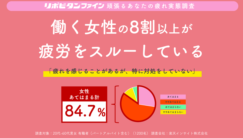 大正製薬株式会社[本社:東京都豊島区 社長:上原 茂]の、朝や日中の疲れや体のだるさを感じる女性におすすめするリポビタンファインは、様々な女性の生活に潜む多様な“疲れ”の実態を明らかにする連続調査企画「頑張るあなたの疲れ実態調査」を複数回にわたり実施しています。