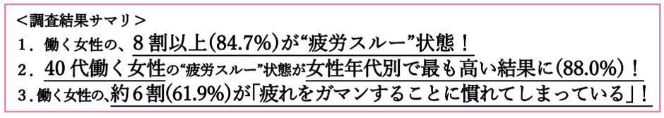 1. 働く女性の、8割以上(84.7%)が“疲労スルー”状態!