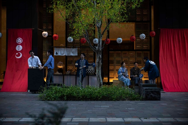 星のや東京酒場は、星のや東京1階の裏手に期間限定でオープンします。日が傾き始めた夕暮れ時になると、建物の一角が、夏祭りの賑やかな雰囲気を思わせるのれんや提灯が飾り付けられた居酒屋に生まれ変わります。法被姿のスタッフが、星のや東京オリジナルの小判と引き換えに、日本酒とおつまみのセットを提供します。小判はチェックイン時に大人1人につき1枚渡されるほか、フロントで追加購入することも可能です。(1枚500円)
