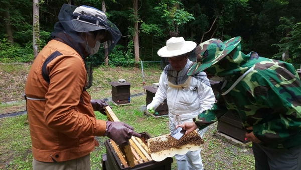 養蜂家の大事な相棒ミツバチの様子も見せて頂く。素手でも怖くないおとなしいミツバチでした。