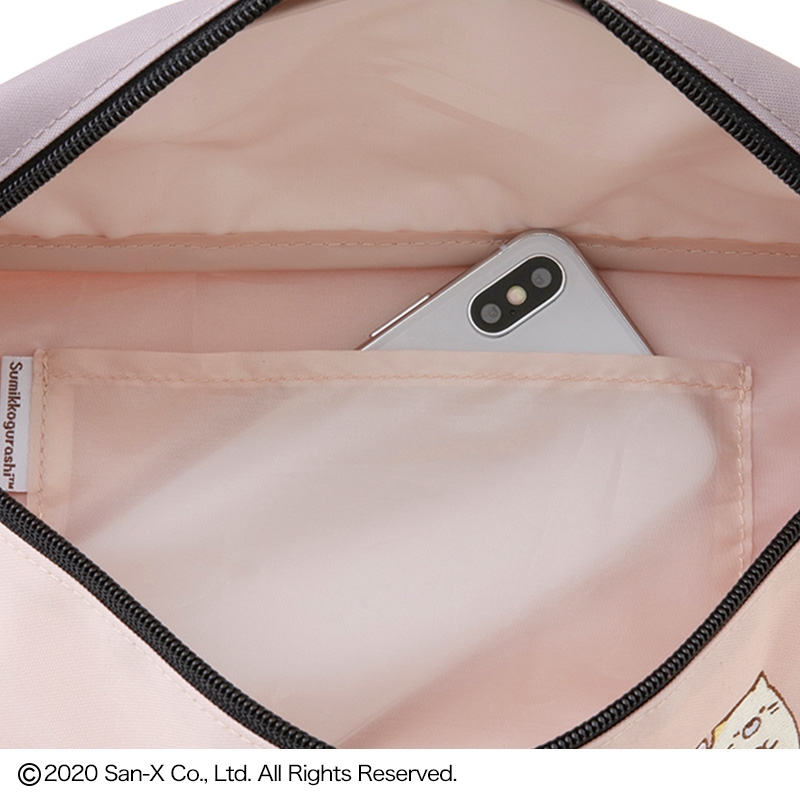 長財布と500mLペットボトルが入るサイズのボディバッグは、しろくま&ねこver. / とかげ&ぺんぎん?ver. / とんかつ&えびふらいのしっぽ&あじふらいのしっぽver. の全3色。バイカラーとバッグのすみにいるすみっコたちの刺繍がポイントです。十分な容量のうえスマホが入る内ポケットつきで引き手は使い勝手の良いロープ仕様と、ディテールのこだわりも満載。