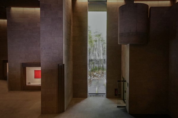 美術館の低めのエントランスは茶室の躙口をイメージしており、その先には大きな柱が聳える大空間が広がります。縦型に設けられた窓は掛け軸にも見え、涼やかな竹林の風景が切り取られています。また、名品コーナーには常時3点の収蔵品を展示しており、展覧会を鑑賞しなくても作品に触れることができます。