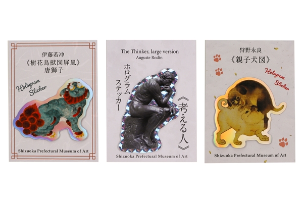 「オーギュスト・ロダン《考える人》」「伊藤若冲《樹花鳥獣図屏風》唐獅子」「狩野永良《親子犬図》」を、キラキラと光るホログラムステッカーにしました。虹色に輝く縁取りがつくことでポップな印象が加わり、お気に入りの作品をさりげなくそばに置いておくことができます。