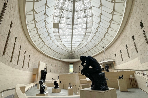 ラグビーボール状のガラス天井が印象的な巨大なロダン館は、別館として1994年にオープン。《地獄の門》をはじめとする32体のオーギュスト・ロダンの彫刻を、天候に左右されずゆったりとした空間で楽しめます。詩人ダンテを表現したとされる有名な《考える人》は、《地獄の門》に設置された63cmのサイズのほか、馴染みのある183cmの拡大版、さらに38cmの縮小版のすべてのサイズを収蔵しています。屋内展示のため傷みが少なく、良好な状態で観覧できるのもロダン館の特徴です。今年2024年はロダン館オープン30周年の節目となるため、10月9日〜12月15日まで収蔵品展「地獄の門ができるまで:素描、試作から完成へ」が開催されます。