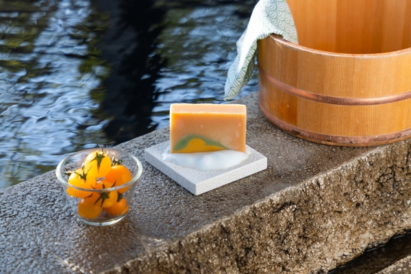 「トマト宝石重」で糖分と水分補給をした後は、夏の強い紫外線で火照り弱ったお肌を「トマト石鹸」と弱アルカリ性の温泉水で優しくケアします。「トマト石鹸」は、コールドプレスで作られた優しい処方のトマト石鹸です。手作りの優しい処方のトマト石鹸は、紫外線を浴びたお肌を労わりながら穏やかに洗います。温泉に入り血液循環が促され、忙しい日々で疲労した身体が疲労回復することで、お肌の調子も整います。入浴後はしっかりと水分補給とスキンケアをすることで、お肌が明るくふっくらと潤います。日々の喧騒から離れ小鳥の囀りや木々の香りで心身ともに癒されるひと時を提案します。