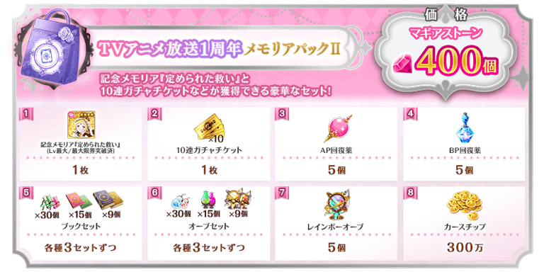 ※「TVアニメ放送1周年記念パック」「TVアニメ放送1周年記念メモリアパックⅠ」「TVアニメ放送1周年記念メモリアパックⅡ」のご購入はおひとり様1回までです。