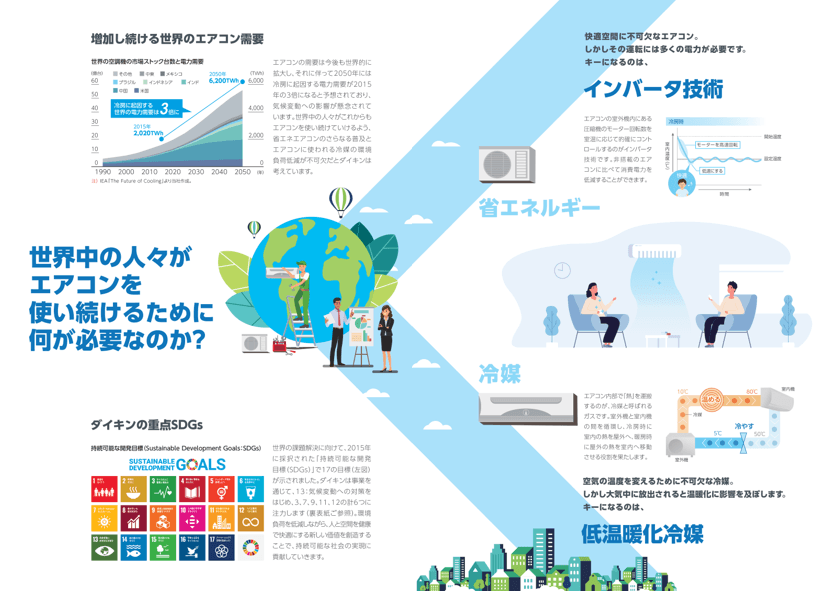空気・環境に関する社会課題の解決と、事業成長の両立を目指し、当社がとりわけ注力してきたインバータ技術と低温暖化冷媒の普及について、わかりやすく解説した三つ折りパンフレットです。