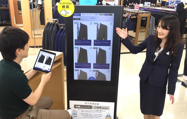 「デジタル・ラボ」は、ネットの豊富な在庫数とリアル店舗の接客サービスの両メリットを最大限に生かしたシステムです。導入店の店内には、当社のECサイトと連動するタッチパネル式の大型サイネージやタブレット端末を複数設置し、来店客はこれらの端末を通してECサイト上にある約1,000万点以上の在庫からお好みの商品を選ぶことができます。当社のECサイトは店在庫とも連動しているため、「デジタル・ラボ」の導入店では「洋服の青山」全785店舗にある在庫を確認することが可能となります。
