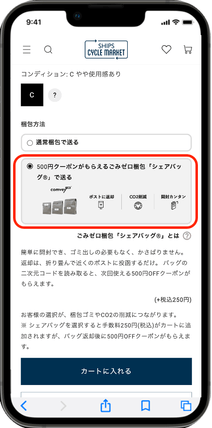 「SHIPS CYCLE MARKET」で商品ページの「梱包方法」でシェアバッグを選択すると、商品がシェアバッグで届きます。シェアバッグを選んだお客様は、ゴミやCO2排出量の削減に貢献できるだけでなく、梱包ストレス(※)を軽減したり、「SHIPS CYCLE MARKET」で次回ご注文に使える500円OFFクーポンを獲得できます。