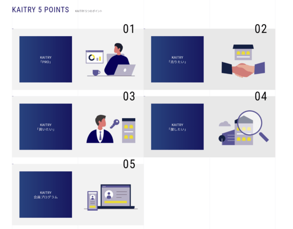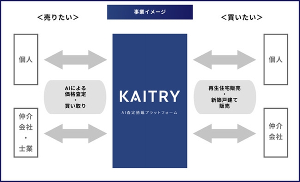 『KAITRY』は、「売りたい人も買いたい人も建てたい人も、プロも個人も、全ての人と情報をワンプラットフォームに」をコンセプトに、BtoB・BtoC両方にアクセス可能な、全方位型のプラットフォームを目指します。まずは、当社グループの最大の強みである中古マンション再生事業に関わるiBuyerサービスからスタートします。