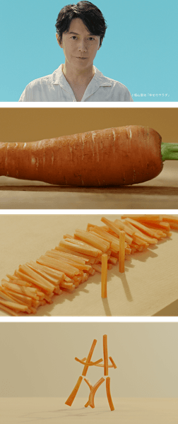 CMでは、「サラダ サラダ サラダ」と思わず口ずさんでしまう軽快なメロディにのせて、プレゼンターとなった福山さんが進化したサンドイッチ“片手で食べるサラダ”を力強く訴求します。新鮮なにんじんをたっぷり使ったサラダのようなサンドイッチ。にんじんが印象的に、かつ、軽やかに踊るシーンにも注目です。