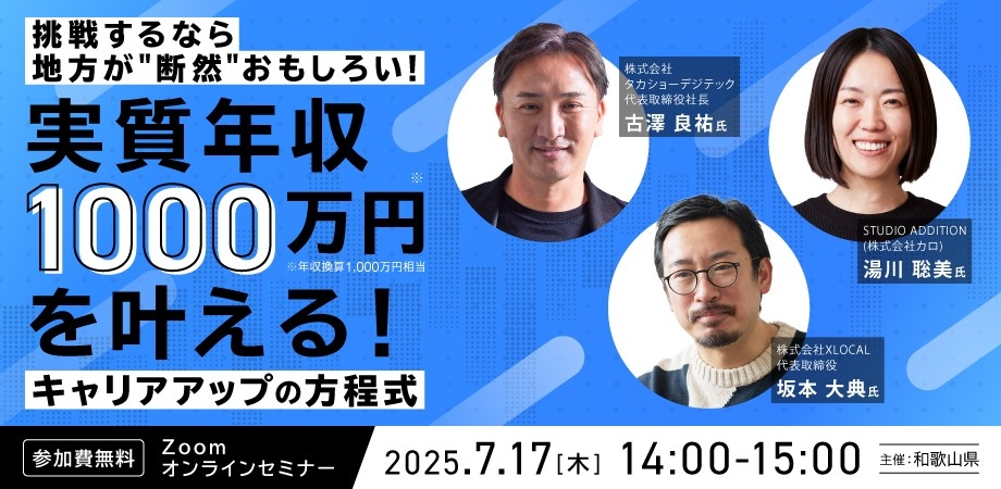 複業・起業・転職、全ての形をカバーした充実の内容です!メインゲストは、地方企業と都市部の現役プロ人材を複業でつなぐプラットフォーム「チイキズカン」を展開する、株式会社XLOCAL代表・坂本大典氏。「地方には、都市にはない可能性がある」と語る坂本氏が、これからの時代に求められる働き方とキャリアの築き方について解き明かします。さらに、起業支援事業の補助金を活用し、和歌山県にハウススタジオを立ち上げた女性起業家、湯川聡美氏が登壇。地方で独自のビジネスチャンスを掴んだ、その具体的なポイントと成功への道のりを語ります。そして、ゲストファシリテーターは、Forbes JAPANにもインタビューが掲載された、株式会社タカショーデジテック代表取締役社長の古澤良祐氏。冬の閑散期に光のフェスティバル「フェスタ・ルーチェ」を仕掛け、観光と経済を動かす地方企業の先駆者として活躍中。その卓越したビジネスセンスにフォーカスします。