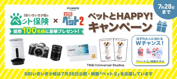 SBIいきいき少額短期保険株式会社(本社:東京都港区、代表取締役社長:千葉 竜介、以下「当社」)は、映画『ペット2』を応援するキャンペーンとして、総勢100名様に豪華賞品が当たる「ペットとHappy!プレゼントキャンペーン」を2019年7月5日(金)から実施します。