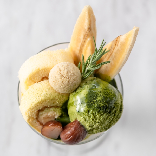 パフェの層は、豆乳で使った抹茶のパンナコッタをベースに、SOKOKOの「ほうじ茶」を使ったジュレ、中には「いんげん豆の煮豆」と「黒蜜風味ようかん」がアクセントに。「ドリームプリンカスタード」で作った濃厚クリームがサクサクとした有機コーンフレークと相性抜群。最後に「SONOKOアイス抹茶」「米粉ロールケーキ」、バナナや渋川栗、「カシューナッツクッキー」をトッピング。ひとつひとつのお味が楽しめる、贅沢でギルティフリーパフェです。