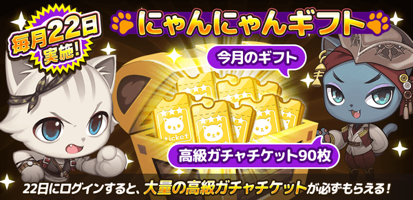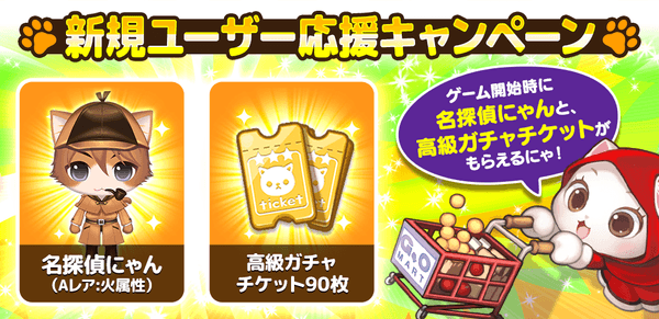 そして、今ならログインするだけで「名探偵にゃん」と「高級ガチャチケット90枚」を全ユーザーにプレゼント!