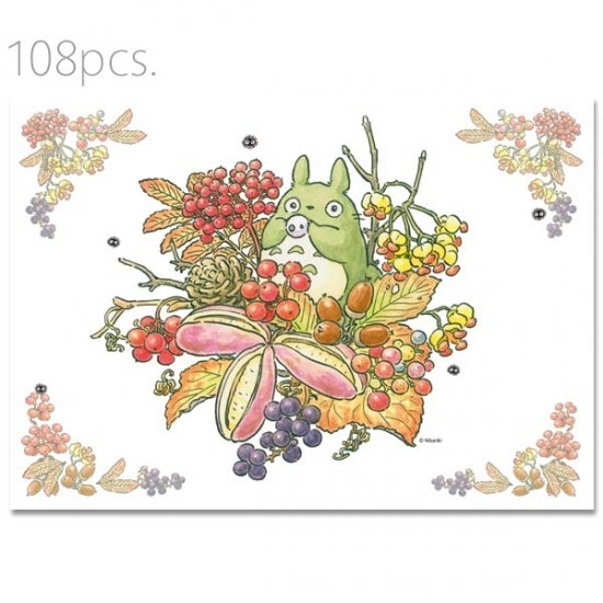 早速ご紹介するのは、となりのトトロのジグソーパズル。パズルのタイトルは”秋の木の実”です。タイトル通り木の実に囲まれたトトロが可愛いデザイン♪木の実の色合いも優しくなんとも癒されるイラストですね。