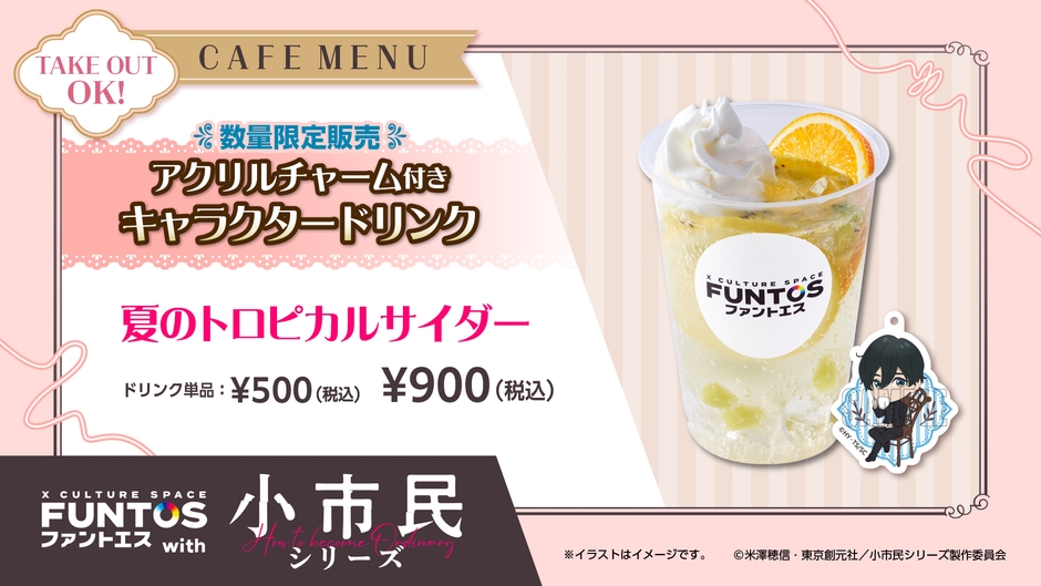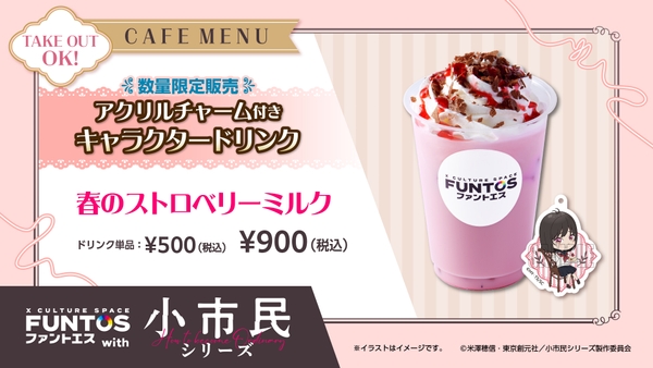 期間中(8月30日~9月24日)、アクリルチャーム付きドリンク900円(税込)、ドリンク単品500円(税込)にて提供いたします。