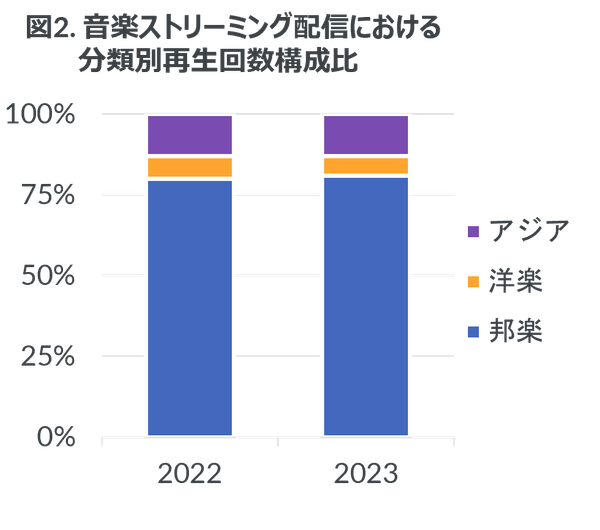 邦楽・洋楽・K-POPを含むアジアのジャンル別に動向*2をみると、邦楽は前年と比較して1%上昇し引き続き大きなシェアを占めた。洋楽のシェアは前年比で1%縮小、アジアは前年並みとなった。再生回数構成比では邦楽が81%、洋楽が5%、アジアは13%を占めた(図2)。