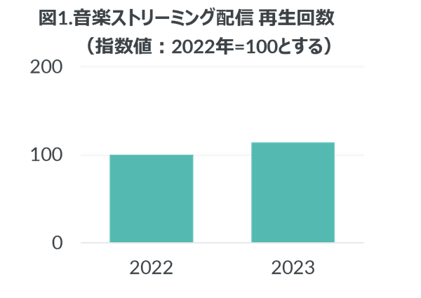 音楽ストリーミング配信市場は、伸長率が減少傾向であるものの、2023年の総再生回数は前年比14%伸長となり増加であった(図1)。