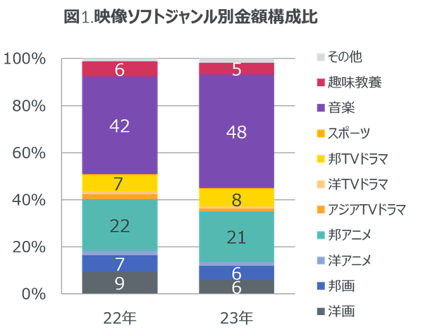 ジャンル別の金額構成比では、「Snow man」や「King & Prince」等のライブ作品で非常に好調だった音楽が前年から6%ポイント伸長し、48%となった(図1)。その一方で、前年「トップガンマーヴェリック」が注目を集めた洋画は構成比6%と前年から3%ポイント縮小となった。