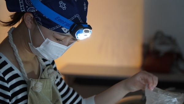 防災クッキングでは、ポリ袋を使ってごはん、ツナカレー、バナナチョコチップ蒸しパンを作りました。災害時の状況を踏まえランタン及びヘッドライトの光のみで調理作業を行う体験をしました。また、包丁を使わずにハサミで食材をカットしたり、効率よく火を通すためのポリ袋の縛り方など、万一の時に必要となるノウハウを身につけることができました。