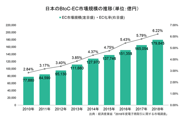 日本国内の消費者向けEC市場規模は2018年に18.0兆円(前年比8.96%増)となり、毎年拡大。商取引におけるECの占める割合(EC化率)も毎年増加しています(※)。