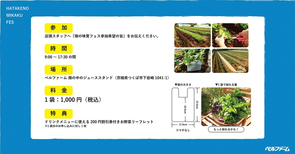 株式会社ベルファームは茨城県つくば市郊外(牛久沼のほとり)に有機農場・冷凍飲料製造工場・ジューススタンドを併設しています。1次産業(生産)、2次産業(加工)、3次産業(販売)を同所で完結させており、ジューススタンドで青汁を飲みながら原料であるケール畑を眺めることができるといったトレーサビリティーの観点からもとても斬新な場所となっています。その環境を活かし、2022年10月22日(土)からジューススタンドテラス席前の畑にて予約不要の有機野菜収穫体験イベント「畑の味覚フェス」を開催中。土や自然に触れながら収穫し、お渡しした袋に入る分だけお持ち帰りいただけます。