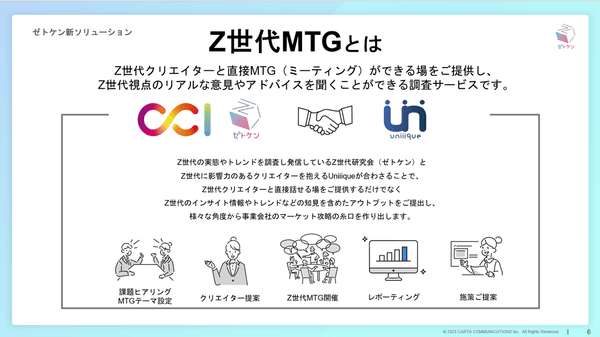 株式会社CARTA HOLDINGSのグループ会社である株式会社CARTA COMMUNICATIONS(東京都中央区、代表取締役社長:目黒 拓、以下「CCI」)のZ世代マーケティングの課題解決を提供するコンサルティングプロジェクト「Z世代研究会(ゼトケン)」(https://note.com/cci_jakumake)は、総合エンターテインメントプロダクションのUniiique※と共同で新サービス「Z世代MTG(ミーティング)』を提供開始いたしました。