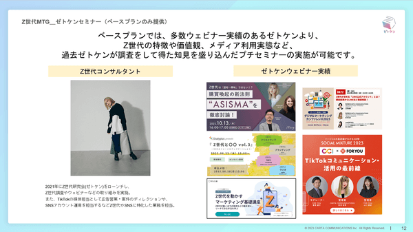 Z世代クリエイターと直接ミーティングができるベースプランのほか、アンケート調査が主体で簡易的にZ世代のリアルな意見を聴取することができるライトプランもございます。