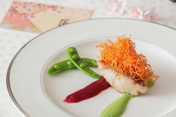 皮目をカリッと焼き上げた旬の魚を、そら豆のほろ苦さと西京味噌の2種のソースで味わう一品。