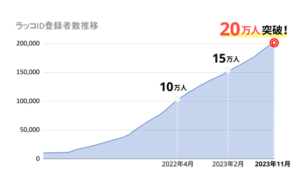 ラッコIDの登録者数は、2023年2月に15万人を超え、その後わずか9か月で20万人を突破しました。15万人を達成した後も、登録者数の増加ペースは緩やかに加速しています。
