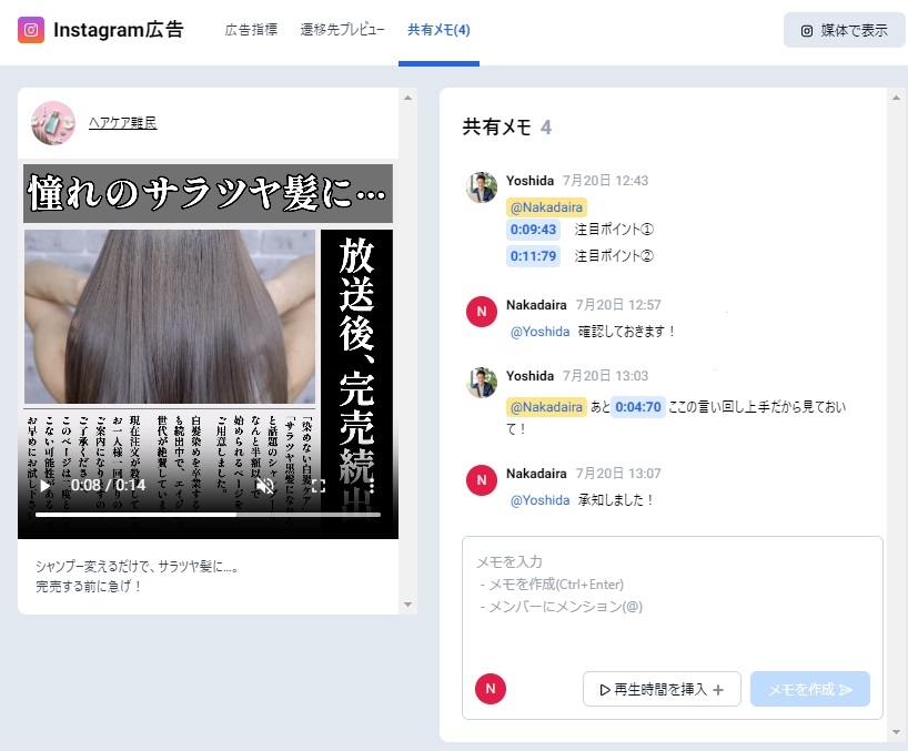 クリエイティブを見て気づいた点を、別のメンバーに簡単に共有することが出来る「共有メモ機能」を搭載しました。