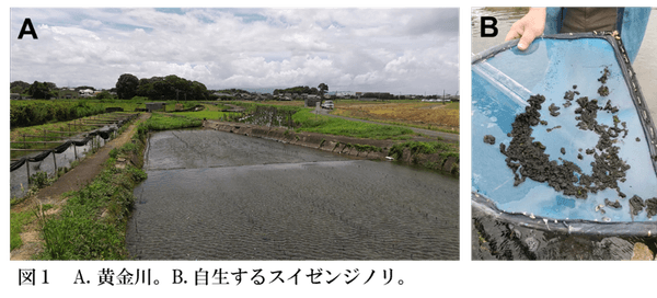 スイゼンジノリ(学名 Aphanothece sacrum 注1) は、日本固有の淡水性ラン藻(シアノバクテリア) 注2)です。 福岡県朝倉市を流れる黄金川 が現存する唯一の自生地だと いわれています (図1)。