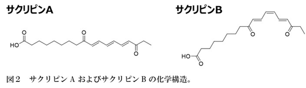 化 学式が同じだが、性質が異なる化合物を異性体という。シス-トランス異性は、有機化合物中の二重結合を挟んで存在している置換基の位置の違いによって生じる。二重結合に対して主要な置換基が同じ側に結合しているシス形と、反対側に結合しているトランス形がある。サクリピン A はトランス型、サクリピン B はシス型である。