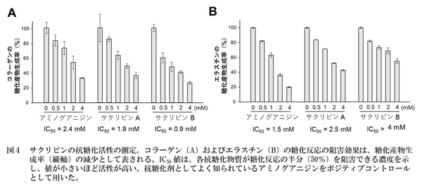 サクリピンA, B の吸収極大波長はともに 320 nm 付近で、日焼けや日焼けによる炎症の原因となる UVA および UVB 領域の波長をよく吸収することが分かりました。また、サクリピン A, B は、紫外線を吸収するだけでなく、アンチエイジングに寄与する抗酸化活性 注6) と抗糖化活性 注7) を示しました。抗酸化活性については、その活性が長時間持続することが明らかとなりました(図3)。また、抗糖化活性については皮膚の真皮の主成分であるコラーゲンとエラスチンの糖化を抑制する効果が確認されました(図4)。これらの結果から、 サクリピン A, B はスキンケアクリーム等への配合剤に適していると考えられます。ヒト皮膚由来の培養細胞に対し てサクリピン A, B が毒性を示さないことも確認されました。サクリピンは食品由来の成分なので、経口サプリメントとしての応用可能性も考えられます。