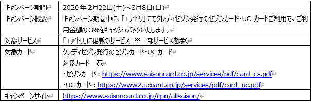 One Asiaのビジョンをかかげ、アジアを舞台に、エアトリ旅行事業、訪日旅行事業、ITオフショア開発事業、ライフイノベーション事業と投資事業を手掛ける株式会社エアトリ(本社:東京都港区、代表取締役社長 兼 CFO:柴田 裕亮、証券コード:6191、以下当社) は、株式会社クレディセゾン(本社:東京都豊島区、代表取締役社⻑COO:⼭下 昌宏、以下:クレディセゾン)と連携し、当社が運営する総合旅行プラットフォーム「エアトリ」(https://www.airtrip.jp/)にて、クレディセゾンが発行するすべてのセゾンカード・UCカードをご利用のお客様を対象に、ご利⽤⾦額の3%をキャッシュバックするキャンペーンを実施いたします