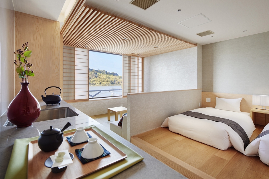 和室にツインベッドと茶処カウンターを備えたお茶の魅力を堪能できる特別室です。到着時、就寝前、起床後の3つのご滞在シーンに合わせたお茶と茶道具をそろえています。