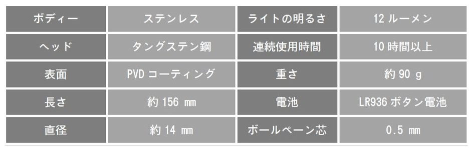 とてもなめらかに書けるボールペン芯を搭載し、握りやすいボディーと重厚感のあるステンレス素材は使い心地抜群です。普段は筆記具として携帯し、サインやちょっとしたメモに便利です。