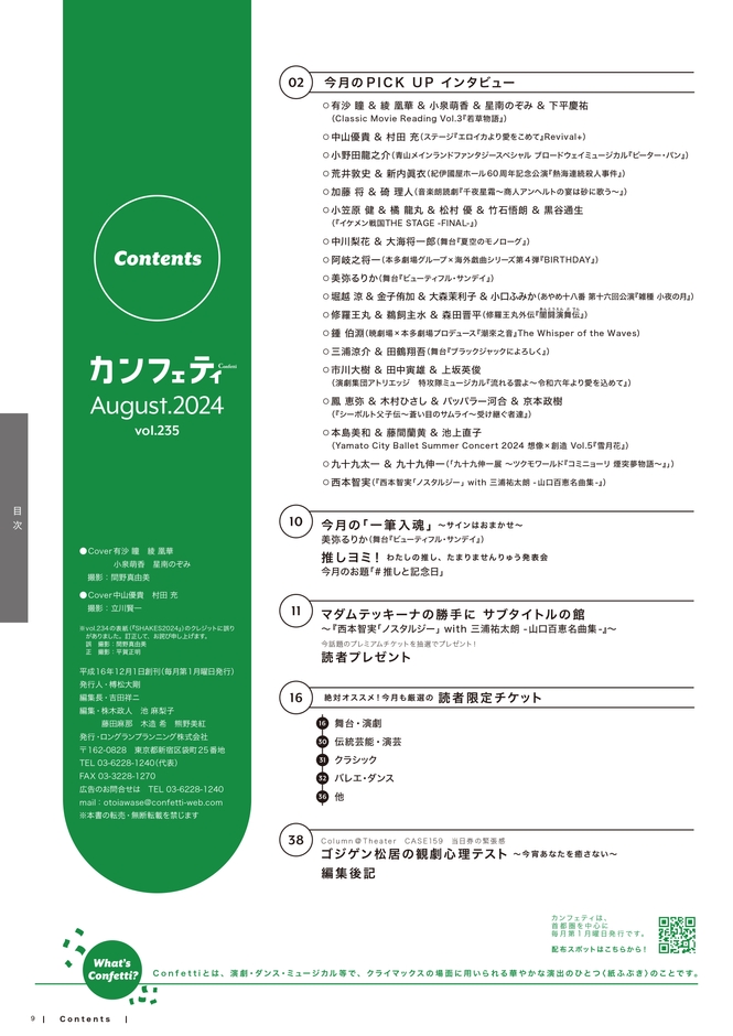 「エンタテインメントを、もっと身近なものに。」を理念とするロングランプランニング株式会社(東京都新宿区、代表:榑松大剛)は、シアター情報誌「カンフェティ」8月号 vol.235 を2024年7月1日(月)に発行いたします。配布場所は、首都圏を中心とした劇場・ショップ・駅など合計1500箇所以上で設置されます。