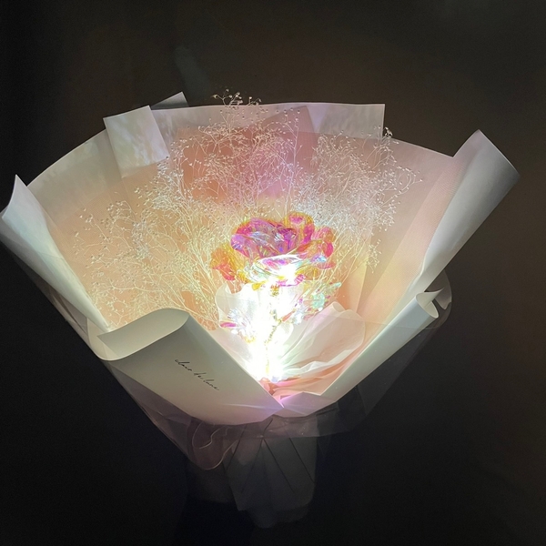 ホログラム素材で作られたバラにブリザーブドホワイトかすみ草で華やかさを加え、LEDライトを点けると夜もキラキラ★☆ムードライトとしても楽しめるインテリアとしても活躍します!