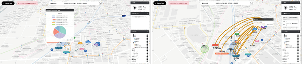 地図開発プラットフォーム「Mapbox」は、カラーリングをはじめ地図を自由にデザインすることができ、ローコードで改修も容易です。特に、レイヤーごとに地図データの表示・非表示が選択できるため、ラベルや道路などのレイヤーを取捨選択し、訴求したい情報のみを見やすく表現できます。また、地図に載せる情報は3Dグラフやヒートマップなど多彩な形式で表示可能です。さらに、SaaS型のためシステムが軽く、大量のデータをインポートしても、地図の回転やズームイン・アウト、表示情報の切り替えやポップアップ、アニメーションなどあらゆる動作が滑らかです。こうした特長から、膨大なデータを直感的・感覚的に把握できる地図を開発することが可能で、この実証実験における様々な分析に貢献しています。