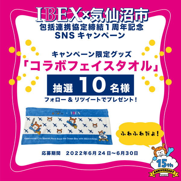 2022年6月24日(金)~6月30日(木)の期間、IBEX公式Twitterアカウントおよび気仙沼市公式観光サイトTwitterアカウント「気仙沼さ来てけらいんWEB」をフォローの上、IBEX公式Twitterより投稿されたキャンペーンツイートをリツイートすると抽選で10名様にIBEX×気仙沼市コラボフェイスタオルが当たります。