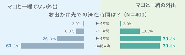 コンビで実施した「孫との外出に関する調査」では、出かけた先の滞在時間が1~2時間と答えた人は、マゴがいない時は26.3%で、マゴと一緒の時は39.8%と、マゴと一緒に外出した時の方が、出先での滞在時間は増えています(※1)。また、マゴとベンチなどに座っている際は自身の体を休めたり、マゴをあやしたりしている人が多いとの結果も出ています(※1)。