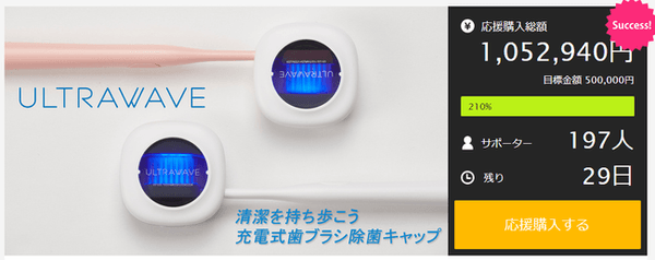 2020年8月19日よりクラウドファンディングサイトMakuake(マクアケ)にて開始した歯ブラシ除菌キャップのプロジェクトが8月19日の開始当日中に支援金100万円を突破しました。