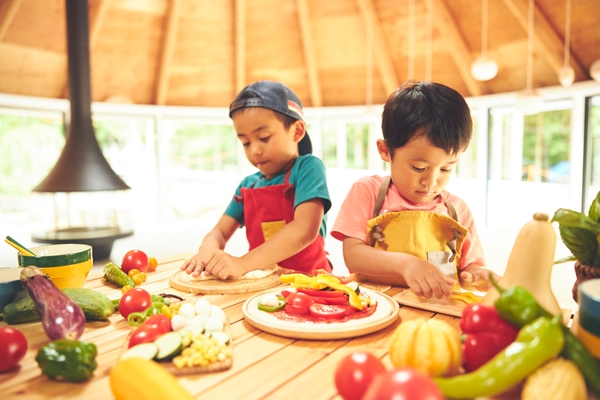 アクティビティ施設「POKO(ポコ) POKO(ポコ)」では、10種類の野菜の中から、生地の上にトッピングしてピッツァを作ります。複雑な作業はないため、小さなお子様も大歓迎です。トッピングができたら、ピッツァイオーロ(ピッツァを焼く人)が、石窯を使って焼き上げます。
