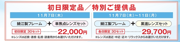 11月7日(木)~11日(月) 鯖江製フレーム+累進レンズセット 29,700円均一 各日限定30セット