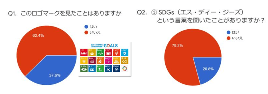 SDGsのロゴマークを見たことがある生徒:37.6%、SDGsという言葉を聞いたことがある生徒:20.8%、普段生活の中で、地球環境保護のために心がけていることがある生徒:48.5%という結果となりました。