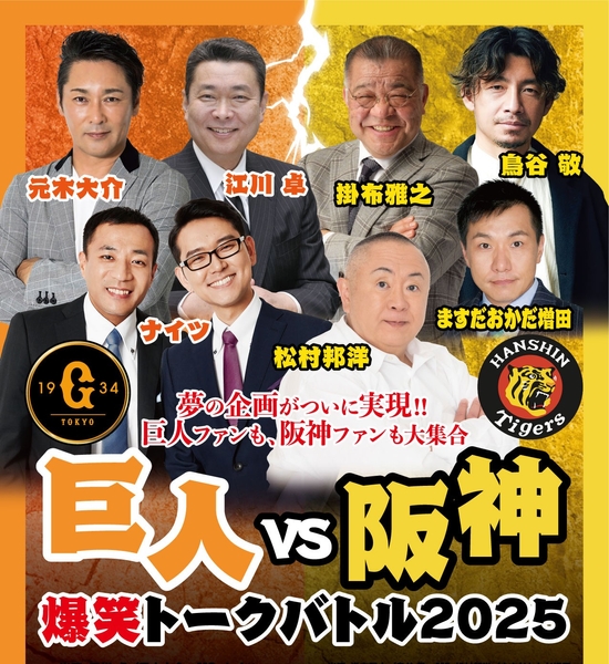 3月1日(土)ニッショーホール(虎ノ門)で開催される「巨人vs阪神 爆笑トークバトル2025」。東西人気球団のスペシャルレジェンドと筋金入りの巨人ファンのナイツ、超阪神ファンの松村邦洋、ますだおかだ増田が繰り広げる「爆笑トークバトル」。今回、イベントにむけて、ナイツ塙と松村邦洋の二人による前哨戦が2025年1月25日(土)よる11時30分よりBS朝日「今度ナニ観る!?~BS朝日イベント検索TV~」にて放送されることが決定した。