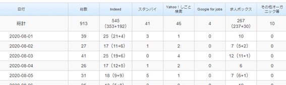 各求人検索エンジン+その他オーガニックからの日々の応募数推移や